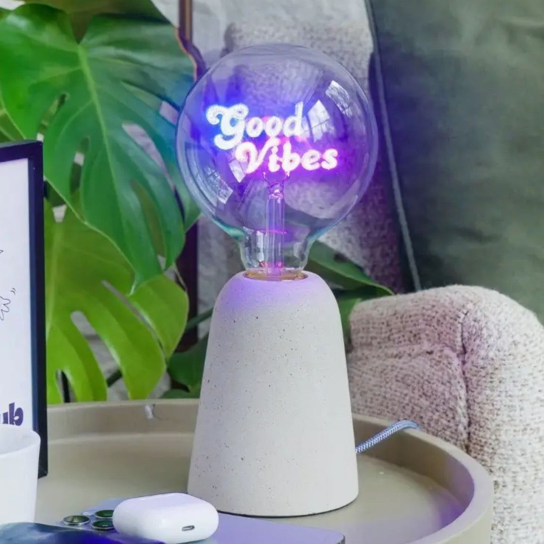 A decorative glass light source with illuminated text that creates a soft, atmospheric glow. Designed as a statement piece for shelves, tables, or windowsills.